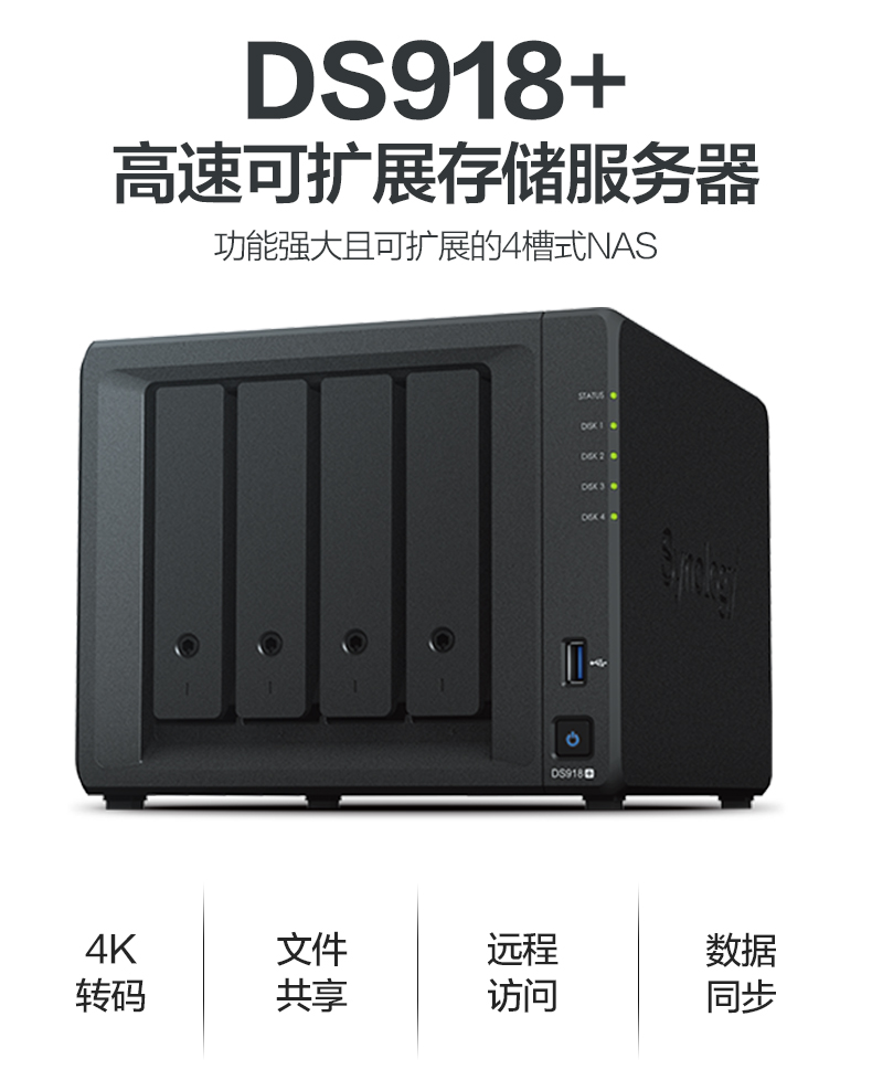 群暉Synology DS918+ 專為中小型企業(yè)和 IT 愛好者而設計。DS918+ 配備強大的內(nèi)置 AES-NI 硬件加密引擎,可提供出眾的加密文件傳輸。DS918+ 還能夠同時轉(zhuǎn)碼多達兩個通道的 H 265 H 264 4K 視頻,是用于共享和存儲超高清媒體內(nèi)容的理想之選。